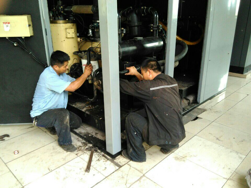 鹿洼煤矿运转工区维修工在对压风机冷却器修复