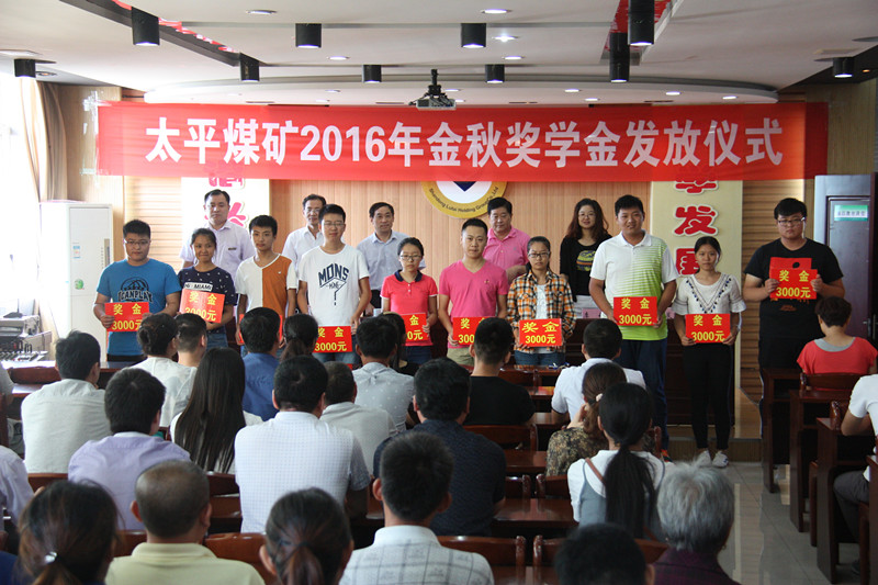 8月26日上午,太平煤矿隆重举行2016年金秋奖学金发放仪式,为职工子女金榜题名喝彩,为莘莘学子成就梦想助力,为职工教子有方点赞。
