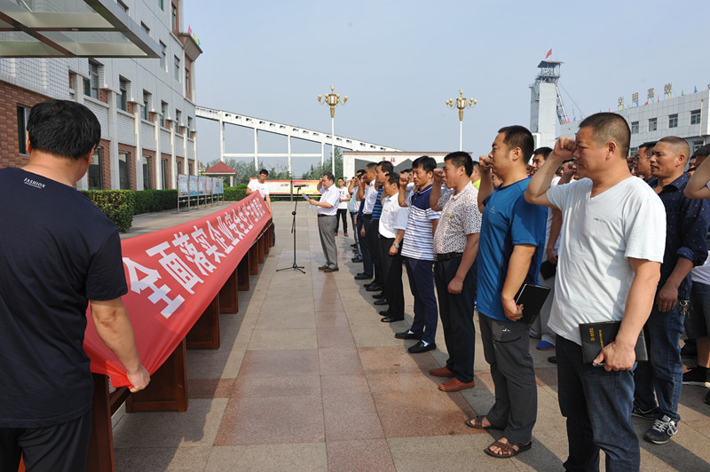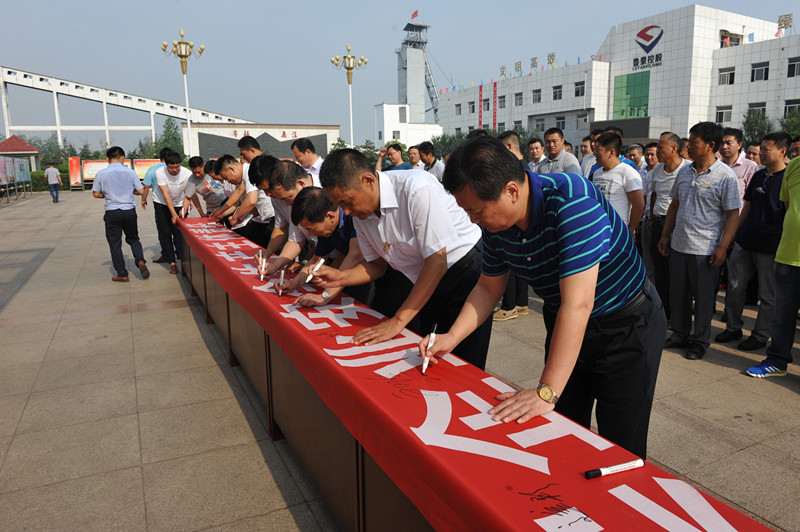 会后,安全副矿长田玉春带领与会人员到行政办公楼前进行了安全宣誓,并在"安全生产月"主题条幅上进行了集体签名。签名后,各单位职工依次到采掘楼大厅观看了"安全生产月"活动宣传教育图片。