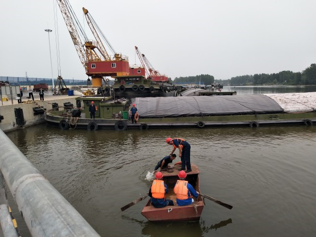 这次演练在河道装有PVC的船上实战演习,重点演练应急队员的救援衔接,联动及时,反应灵敏。现场演练准备就绪后,随着救援演练总指挥一声令下,演练正式开始。在船上作业的船员意外失足落水,另一名目击随即发出求救信号,救援组成员在朱玉宝经理的指挥下,收到求救信号后,迅速做出救援响应,组织救援组人员进行救捞。在全体救援组人员的紧密分工合作下,短短两分钟内,落水人员被安全救上船,医护组在第一时间内对其进行心肺复苏抢救,经过一系列现场模拟环节,最终落水人员成功获救,物流港负责人召集所有参演船员进行了简短总结,救援演练活动圆满结束。