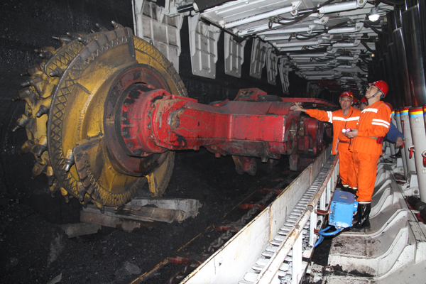 在首采面503综采工作面,李合军详细了解了工作面地质条件、生产工艺、设备配型等情况。据悉,503综采面是百吉项目部首采面,工作面沿煤层倾向布置,垂直煤盘区巷方向推进,推进长度为520m。切眼煤壁长100.5m,煤层平均煤厚4.2m。综采工作面回采期间配置62台双柱式综采液压支架,顶板实行全支护垮落法管理。该工作面服务时间为4个月,月产量可达7万吨以上,项目部年产量可达80万吨。