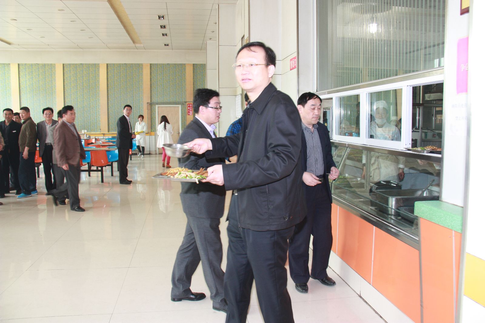 座谈结束后,李合军来到职工食堂,跟大家一样拿起餐盘,打好饭菜,同职工们一起用餐。他边吃边同运转工区职工李娟、采一工区班组长付贵波、皮带工区区长陈宗桥进行了交谈,详细了解他们的生活、工作、思想等情况。