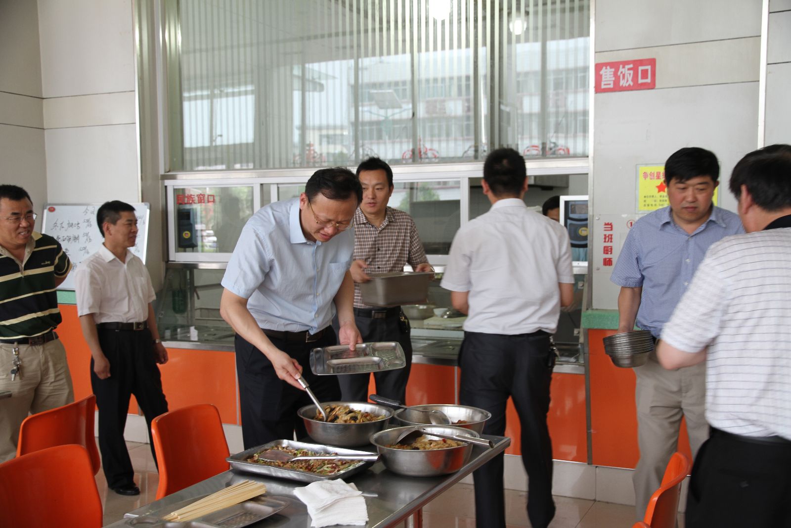 中午,李合军到太平煤矿职工餐厅和职工一起在大餐厅就餐。