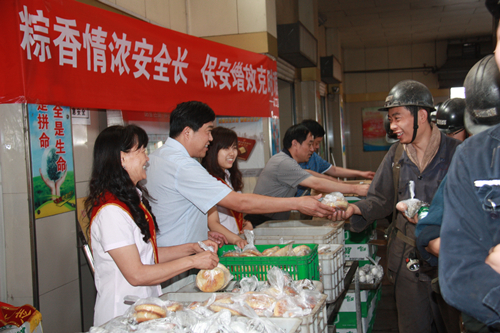 今年6月20日是我国传统端午节,太平煤矿工会组织女工协管员到副井上井口开展了"粽香情浓安全长 保安增效克时艰"井口慰问活动。