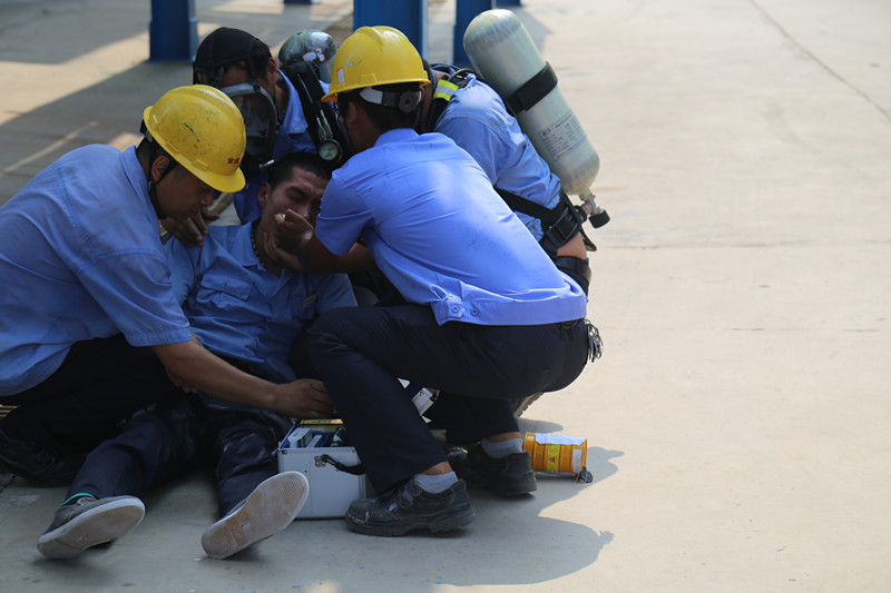 演练进行的是模拟山东开云(中国)化学有限公司液氯罐区泄漏事故。演练现场,事故造成现场职工轻度中毒。现场工作人员发现泄露后,立即向调度指挥中心报告,救援人员第一时间对轻度中毒的工作人员进行简单救治,并立即拨打120请求增援。公司同时启动液氯罐区泄漏事故应急预案,派出抢修人员对泄漏点进行紧急抢修、堵漏。在发现事故险情超出企业救援能力时,鱼台县政府启动应急预案,公安、质监、环保、卫生等有关职能部门赶赴现场,进行联同作战,根据各自的职责组织事故救援。