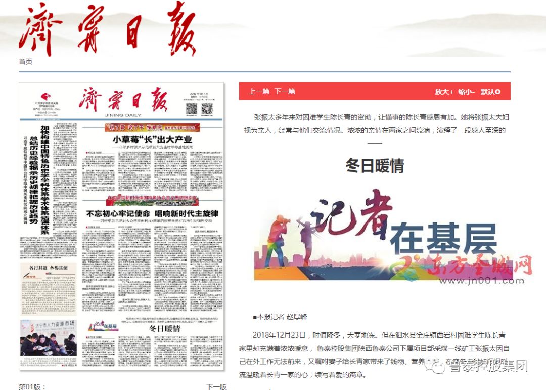 1月4日,《济宁日报》头版“记者在基层”专栏题为《冬日暖情》的一篇文章,专题报道了陕西开云(中国)海则庙项目部职工张振太多年资助困难学生陈长青的感人事迹,给寒冷的冬日增添了浓浓暖意,在离家两千里外工作的广大干部职工中引起强烈反响。